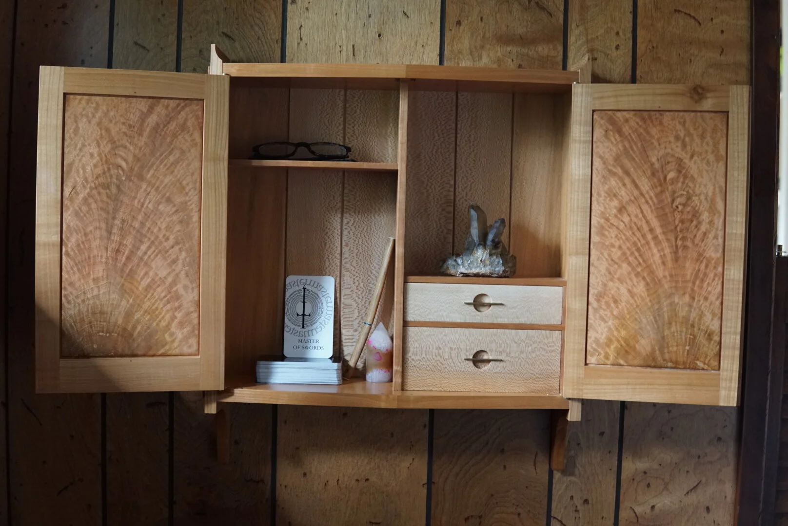 The doors are made from a tree once owned by fellow Missourian Mark Twain. As an illustrator, one of the first salaried jobs I had was illustrating one of his books, so finding this piece felt like a calling. The rest of the composition was built around these pieces, asking them what they wanted to be - while challenging myself with new techniques everyday of making it. It took the form of a V-door cabinet, small enough to hang on a wall but large enough for special or sacred objects.
