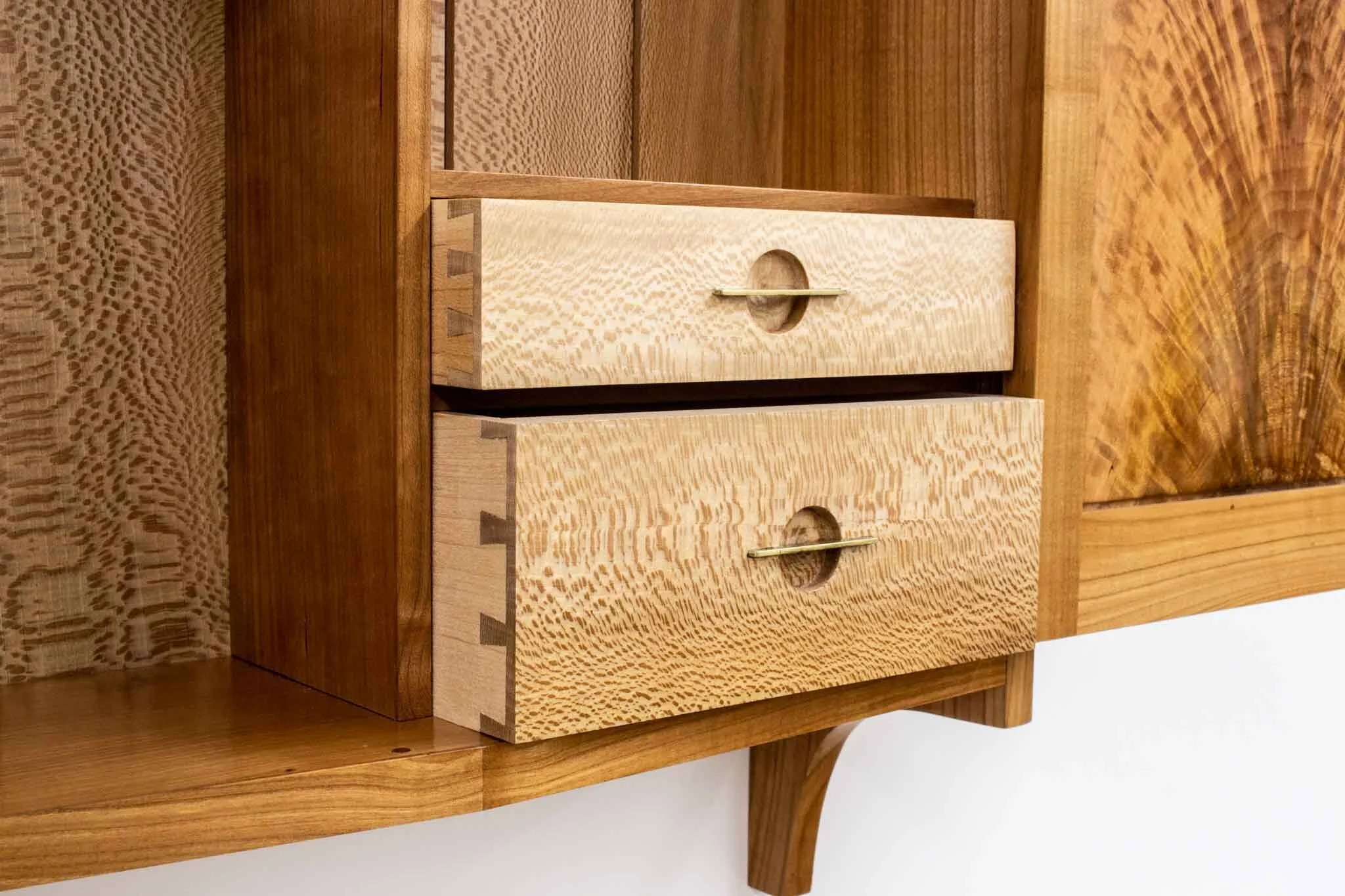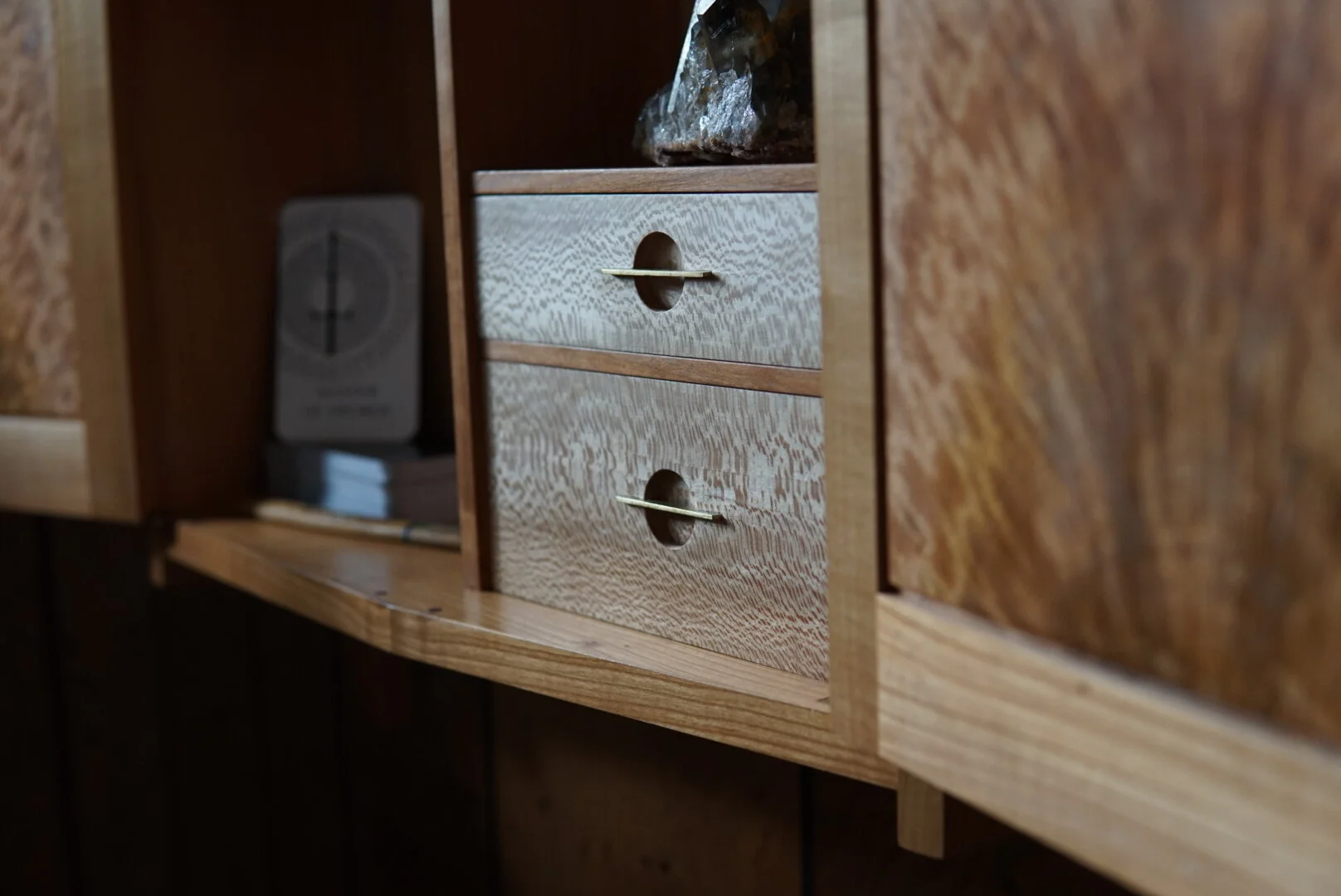The body of the cabinet is made from Cherry, which often symbolizes impermanence, while the back is in Sycamore which connotes grace. There are highlights of Manzanita, a shrubby bush native to California, symbolizing rebirth as it only propagates through fire, and afterwards is the first green plant often seen after the winter rains.