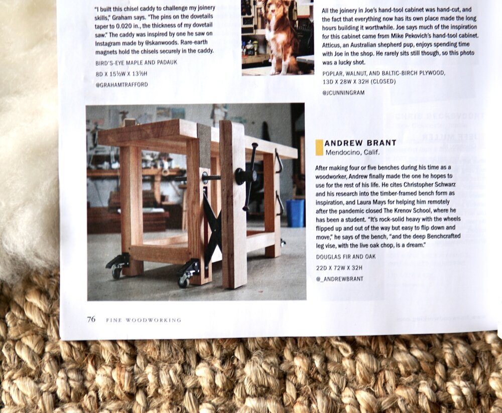 A couple months ago the kind people at Fine Woodworking Magazine reached out a bit ago to run a photograph of my workbench! It’s just a small photo and a blurb, but it means a lot to me. If you don’t know Fine Woodworking Magazine, they’ve been around since the late 1970’s and really rode the wave of really heavy interest in woodworking through the 80’s and early 90’s. James Krenov wrote for them often, George Nakashima, and since then has become the standard for American magazines dedicated to teaching the craft of woodworking. So it’s a big honor to be included.